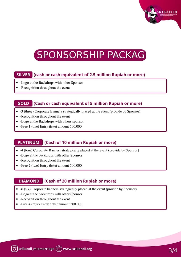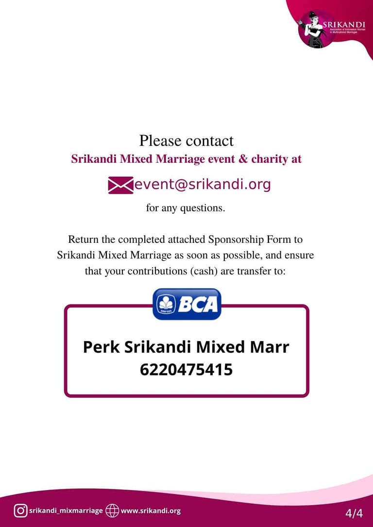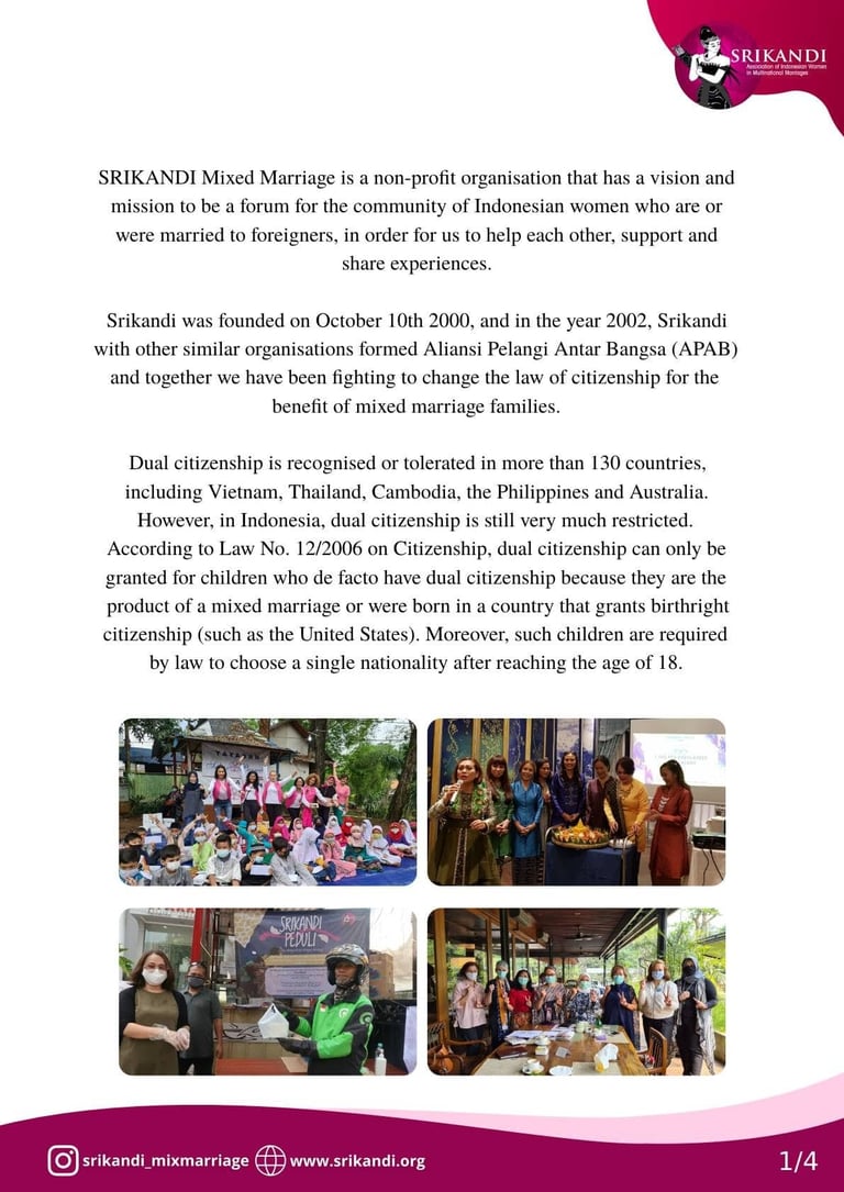 SRIKANDI Mixed Marriage is a non-profit organisation that has a vision and mission to be a forum for the community of Indonesian women who are or were married to foreigners, in order for us to help each other, support and share experiences.