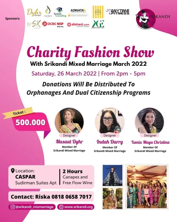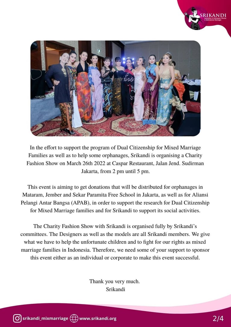 In the effort to support the program of Dual Citizenship for Mixed Marriage Families as well as to help some orphanages, Srikandi is organising a Charity Fashion Show on March 26th 2022 at Caspar Restaurant, Jalan Jend. Sudirman Jakarta, from 2 pm until 5 pm.